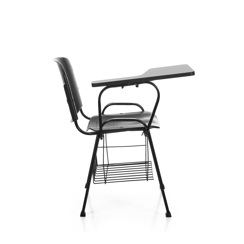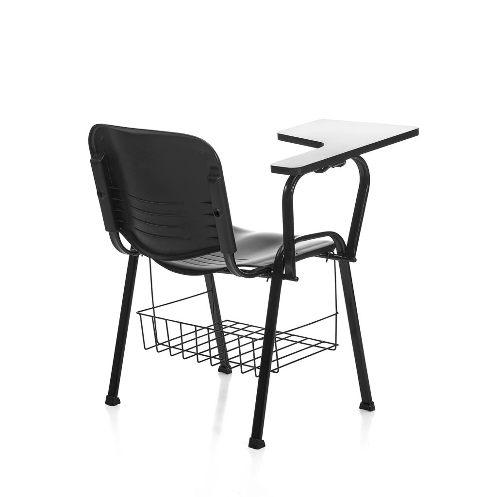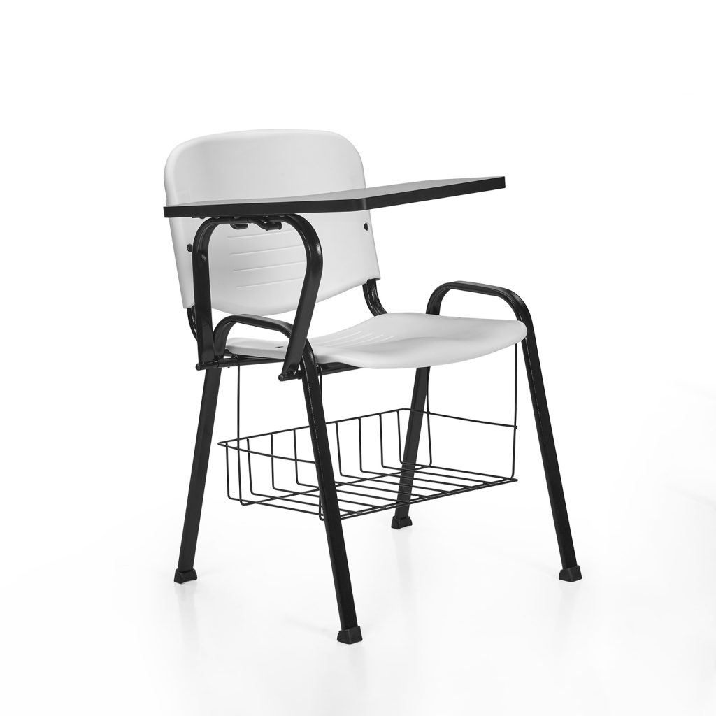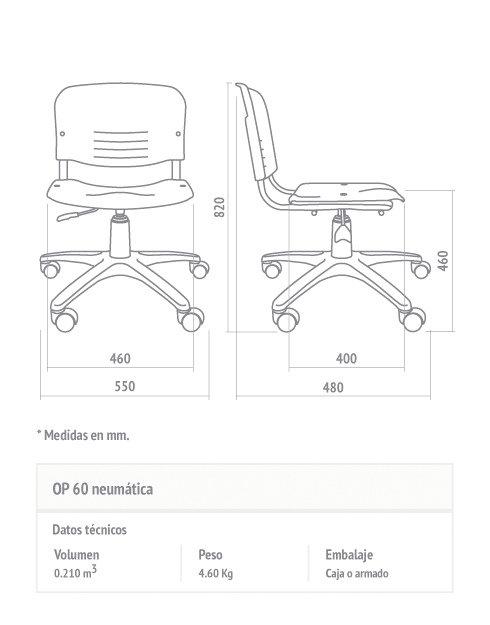 - Opcionales: Apoyabrazos. Estructura fija de 4 patas con apoyabrazos integrados. Kit Apoyapies. Kit Pupitre de madera. Canasto porta útiles. Regulación neumática de altura de asiento. Ruedas revestidas de material elastómero, muy silenciosa.